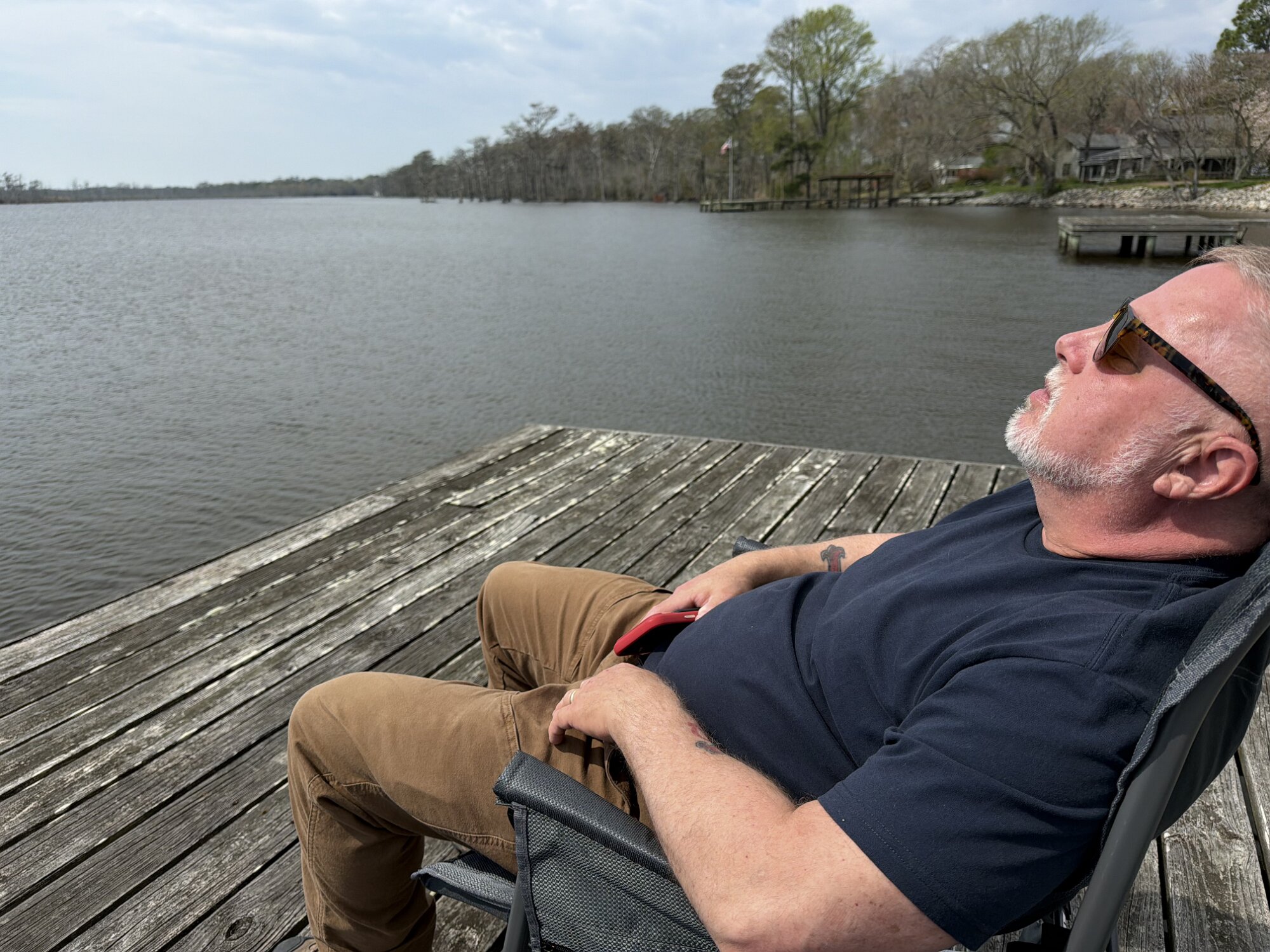 3/23/26 Footings - Tom enjoying the amazing 82 degree day on our dock